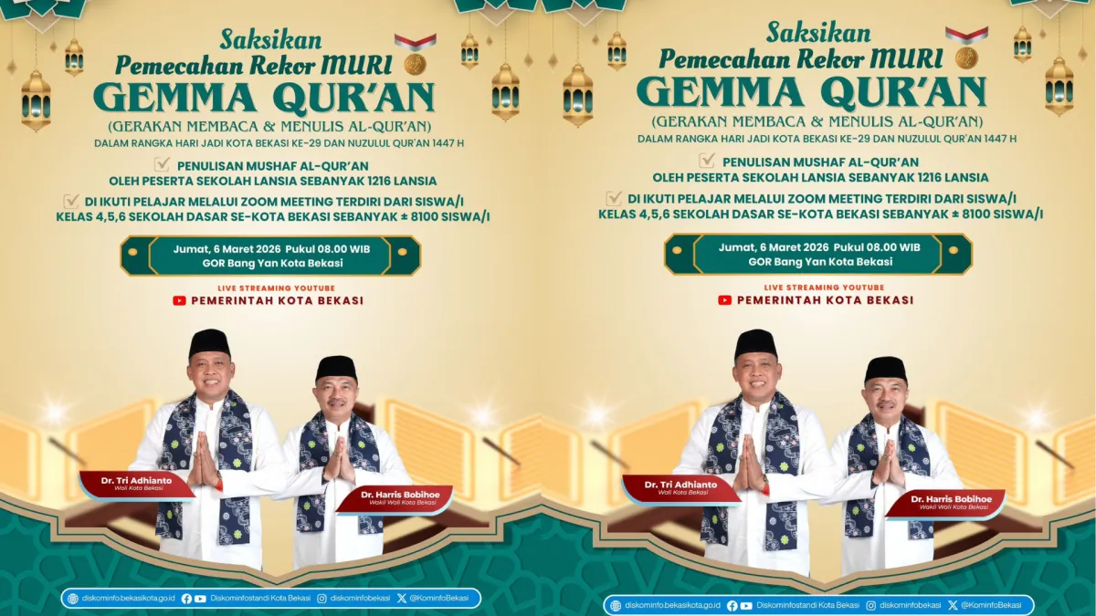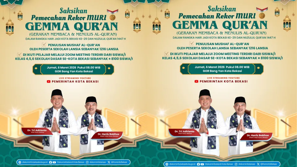 Bekasi - Pemerintah Kota Bekasi kembali menciptakan momentum religius yang besar. Dalam rangka memperingati Hari Jadi ke-29 Kota Bekasi sekaligus momentum Nuzulul Qur’an 1447 Hijriah, pemerintah daerah akan menggelar kegiatan pemecahan rekor nasional melalui program GEMMA Qur’an (Gerakan Membaca dan Menulis Al-Qur’an).
